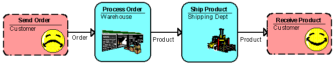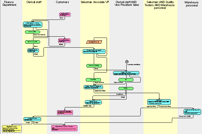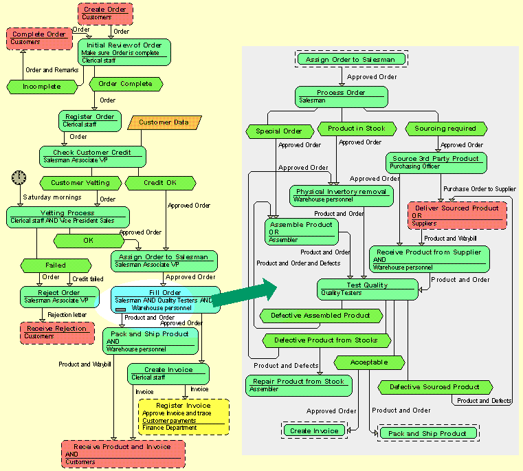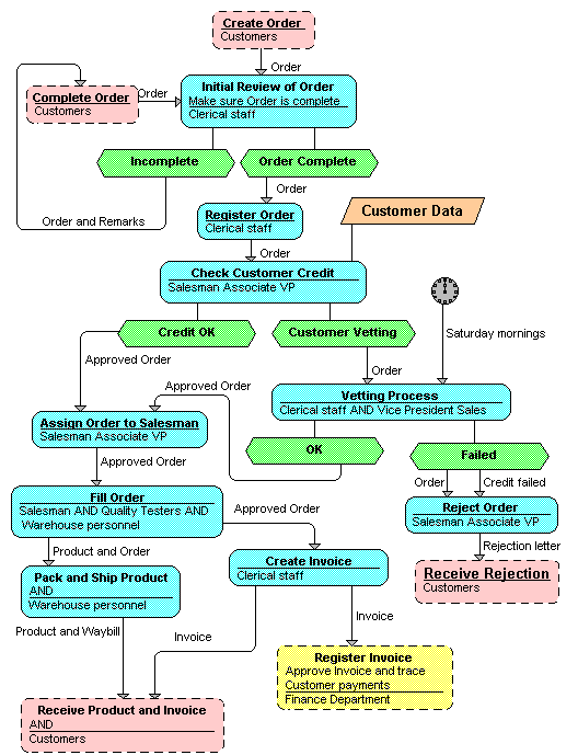 | This diagram represents a simplified version of an order processing subprocess in a trading company. An order received from a customer is passed to the Initial Review performed by the Clerical Staff. If the order is incomplete it is returned to the customer. If the order is complete it is forwarded to further processing. After the order has been registered the customer's credit is checked. If the customer's credit is good, the order is filled and the ordered products together with the Invoice are sent to the customer. At the same time the Invoice is sent also to the Finance Department. | |