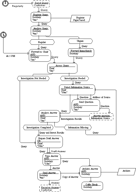 The other important criterion is the possible tool support in the analysis of the described business system. Again the more formalized is the approach, the richer set of tools is available. In most cases, e.g., [5], the tool support reduces to simple consistency checking, reporting and some static evaluation, most frequently, finding the critical path in a weighted flow graph. The other tools offer dynamic prototyping and simulation as the main analysis method. Among the known BM systems Designer 2000 [6] should be mentioned.