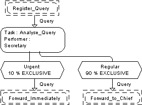 The next important part of a task is its performer. Performer specification consists of one or more performer names connected by AND and OR connectors. Performers may be organizational units, persons (positions) and equipment (resources). The available performers and their number are specified in the ORG diagram of the business model. The requested performers must be free before the task can really start, therefore the triggering condition is only the necessary condition for a task to start.