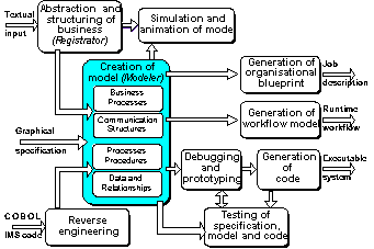 Functional modeling in GRADE starts in Registrator with creation of Activities subtree. Each Activity can have 'consumes/produces' relationships with POs. This kind of description corresponds to TSD diagram (Figure 4) in Modeler. The definitions of Tasks can be obtained from Registrator via converter. Similarly the definition of PD diagrams can be obtained. Thus the functional and behavioral definitions of objects can be supported either by Registrator and/or Modeler. Important question here is the optimality of Business Model (TCD). The question of optimality concerns 2 aspects - structural and parametric. Considerable efforts are devoted to the parametric optimization of problem like finding optimal attribute values for Tasks in TCD. This group of problem includes detection of most appropriate performers for each Task. There are several attempts to solve this kind of problem also in GRADE context [Tent92], [Kaufm95]. However, the possibilities to improve the system through the parametric optimization are limited by the structure of processes (sequence of tasks within business transaction). In a case of fundamental restructuring of the system, the question of optimal structure of processes (TCDs) should be solved before parametric optimization. Figure 11 depicts (in a form of GRADE PD diagram) the development of optimal Business Process.