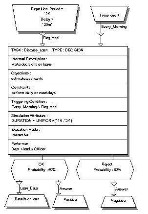 Tasks are initiated (triggered) by input events and produce output events. Tasks are performed by one or several performers (Active Objects). Branching is enabled by Decisions chosen with specified probabilities.