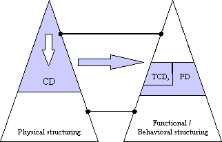 In each step of system development life cycle all of the mentioned submodels (physical, behavioral, functional and data) can be created. Each submodel can be considered as hierarchically arranged set of diagrams. Therefore they are represented in Figure 7 in a simplified form as triangles. In this figure we have 3 triangles - one for physical, functional and behavioral model. The 2 latter are partially overlapping and representing the dynamic aspects of the system. The triangular areas with gray background represent mandatory parts of model. The white areas can be developed optionally. The business submodel (polygon with TCD) is represented as an intermediate step between physical structuring and description of behavior (PD tree). The figure shows, that business process modeling provides high level description of processes and that the same processes can be described alternatively and/or on more detailed level by Process Diagrams. Business model (TCD diagrams) is linked with Behavioral models (PD). The Behavioral submodel can be generated largely automatically from the Business submodel. The central problem of the proposed methodology is how to ensure appropriate correspondence between: