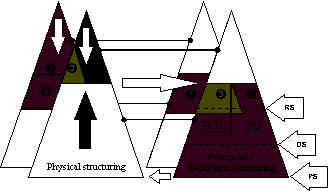 In this figure we have the current system structuring trees in the background. These trees are gradually substituted (in the picture - covered) by design model. Three stages (RS - requirement specification, DS - conceptual design specification and RS - Physical design specification) within the design model are depicted by arrows and dashed lines in the functional structuring area. The design model is not built anew. It is based on the CS model. If we compare the location of these triangles we can see that they are partially overlapping. It symbolizes the reusability of parts of the CS model. We can detect three different areas both in physical and functional trees. 1. During the shift from the CS model to requirement and design models part of the CS model is omitted. It does not necessarily mean that these elements are deleted from the new system. This may be also the unmodified part of the system that remains without changes also in the new system, however, it is deleted from the design model as it may have relatively small or none influence to other parts of the system. 2. There is a considerable amount of new elements added to the requirements and design model (e.g. polygons 2 in Figure 9). These new elements are first defined in RS model and further specified and refined in DS and PS models. This is actually the most important part of the design model. 3. The third part is that which is overlapping for both models - the CS and the design model. It includes: