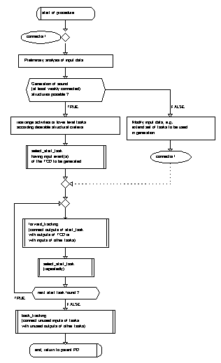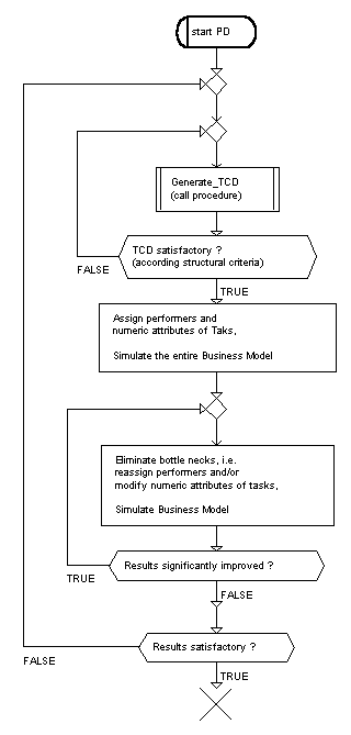 The algorithm for generation of optimal process structure (see Figure 13 which is depicted as subroutine of the optimization process) uses principles of random search and forward tracking. The algorithm starts with one of the tasks processing input of the entire TCD. This task can be connected according 'depth-first' search with other tasks consuming the output of the first task and so forth. The connection criterion of two tasks is 'identical names of the corresponding events' (i.e. output event of one task and input event of the other task). Thus the success of generation algorithm depends considerably on event naming. Events with identical names are considered model-wide as identical events and vice versa. Therefore special attention should be paid to correct naming of events (without unwanted synonyms and homonyms). The connection procedure can be completed for one path as soon as the expected output of the entire TCD is achieved. The TCD can be considered as completed when all expected outputs of the TCD are connected to inputs via at least weakly connected graph. The generation algorithm can use also information from simulation scripts of active objects (if they are mentioned as performers of tasks at this stage of project). It may be useful to perform a preliminary checkout procedure before the start of the algorithm. This procedure can check the possibilities to create at least one weakly connected structure or several alternative versions. The description of the parent TSD or the set of included (lower level) TSDs should be modified if the generation of a new TCD structures is not possible. This may happen for design of new processes based on hierarchical definition of tasks via TSDs or Registrator's activities. For restructuring of the existing processes often several alternative versions are possible. In this case the generation algorithms can be adjusted and controlled according the following criteria [Grundsp88]: